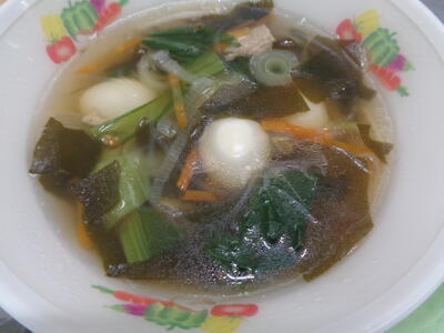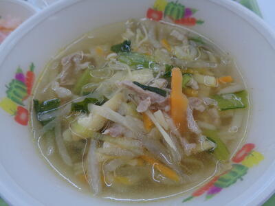 スープの「春雨スープ」は、4種類の野菜と鶏肉、うずらの卵、春雨など8種類の食材を使っています仕上げに、風味のよいごま油も加え、風味豊かな中華スープに仕上がりました
