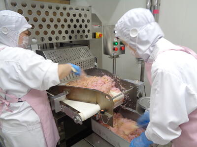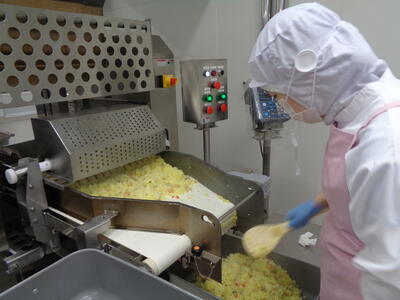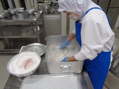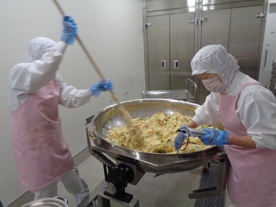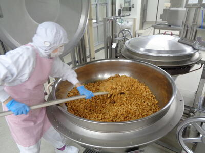 毎日、給食室の炊飯室で、60kgのお米を洗米し、炊き上げています