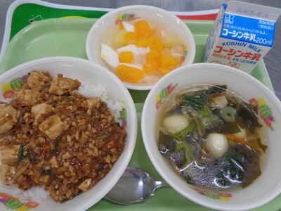 『牛乳 マーボー豆腐丼 春雨スープ フルーツ杏仁豆腐』