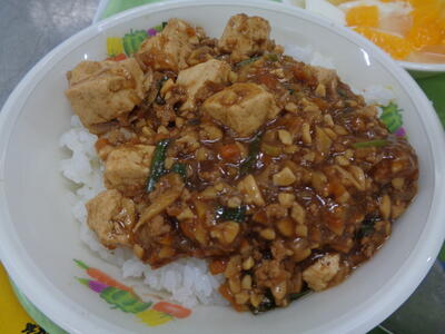 今日は、豆腐たっぷりの栄養バツグンの「マーボー豆腐丼」給食のマーボー豆腐は、豆腐の他に、豚肉や人参、長ねぎ、ニラなど9種類の食材を使っています