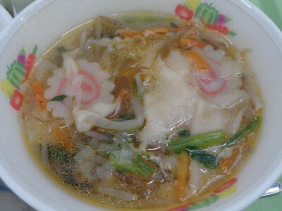 「ワンタンスープ」は、野菜をたっぷり使い、仕上げにワンタンとごま油を加えました。のどごしツルっと、ごま油の風味のきいた栄養バツグンのスープです