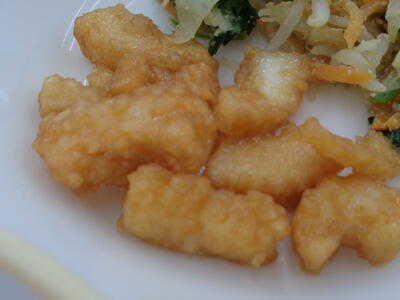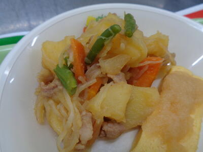主菜の「イカのかりん糖揚げ」は、小さく切ったイカに米粉をまぶし、油でカラッと揚げました特製の甘辛いタレをたっぷりからめてあるので、ご飯との相性もバツグンです