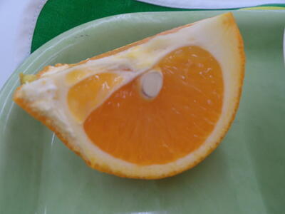 副菜の「ごま和え」は流山産ほうれん草に人参、キャベツ、もやしを使い、風味の良いゴマダレを和えました今が旬の果物、清美オレンジは、大変甘く、ビタミンCがたっぷり含まれています