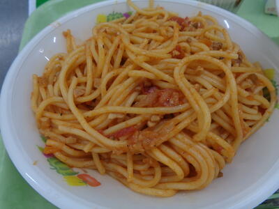 今日は栄養バツグンの「ミートスパゲティ」給食のミートソースは9種類の食材を使っているので味や食感、風味が複雑に重なり合い、相乗効果で美味しさがアップしています