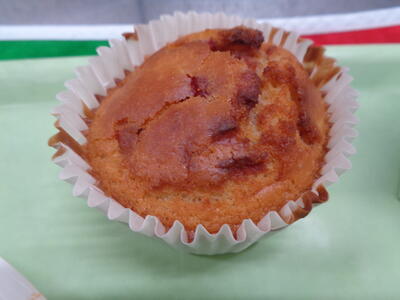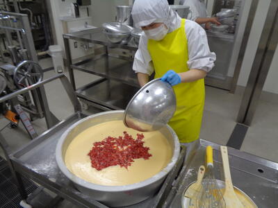 「手作りの苺マフィン」は、米粉と卵、バター、ベーキングパウダーなどを混ぜ合わせた生地を調理員さんたちが一個ずつカップに注ぎ、オーブンで焼き上げましたふっくらと膨らみ、苺の風味も味わえます