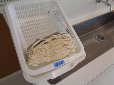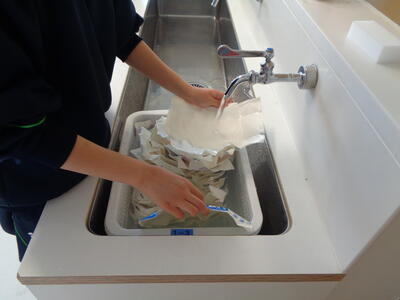 「牛乳パックのリサイクル」を毎日行っています給食終了後、各自が開いて洗い、専用のカゴに入れて乾かしています