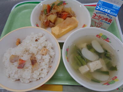 牛乳 鯛めし 厚焼き卵の大根おろし添え 肉じゃが すまし汁』