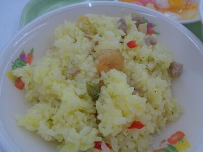 給食のパエリアも「サフラン」を入れてお米を炊き上げ、鮮やかな黄色に染まりましたそして、魚介類のイカ、エビ、鶏肉、玉ねぎもたっぷり加え、栄養バツグンのパエリアが出来上がりました