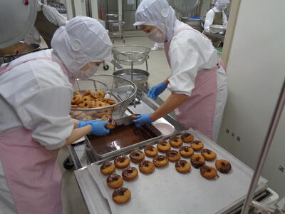 【人気のチョコ付きドーナツ一つずつ丁寧に油で揚げて、湯銭したコーティングチョコをたっぷり付けました