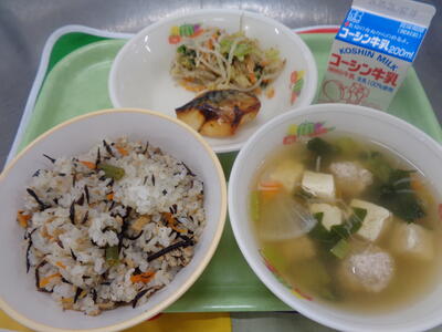 『牛乳 ひじきご飯 鯖の文化干し アーモンド和え 手作り肉団子汁』