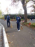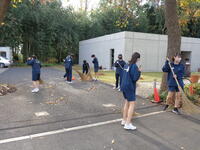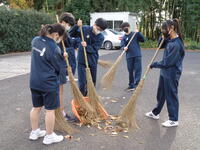 などと話し、掃き始めると黙々と作業をしていました。葉っぱを隅々から集めている生徒たちの姿から、学校の入り口をきれいにしようという貢献の気持ちが伝わってきました。