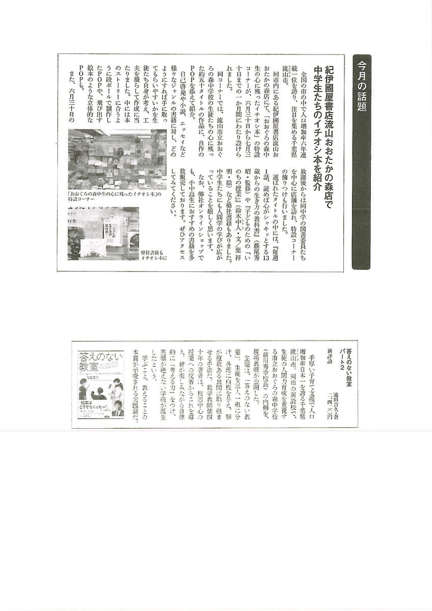人間学を学ぶ月刊誌「致知」に記事が掲載されました! 投稿日時 : 08/18 おおぐろの森中学校管理者 カテゴリ: 人間学を学ぶ月刊誌「致知」9月号に、本校の取り組みである紀伊國屋書店でのブックフェアの様子と、 池田教諭の書籍「答えのない教室パート2」が紹介されました。 {{options.likeCount}} {{options.likeCount}}