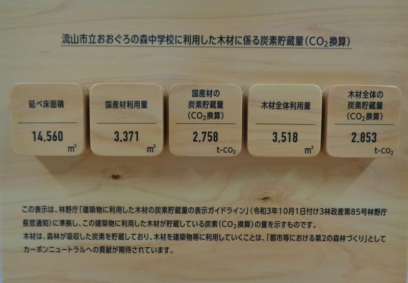 おおぐろの森中学校の校舎に利用した木材量やそれに伴う炭素貯蔵量を示すサインを設置しました。