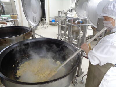 今日は、おおぐろの森中学校人気№2の「チキンカレーライス」鶏肉を使ったコクのあるおいしいカレーができあがりました。手作りのカレールーは、バター6kgと小麦粉6kg、カレー粉を1時間ほどじっくり炒めて作ります!マイルドな風味とピリッとした辛さ、野菜の甘みが味わえます