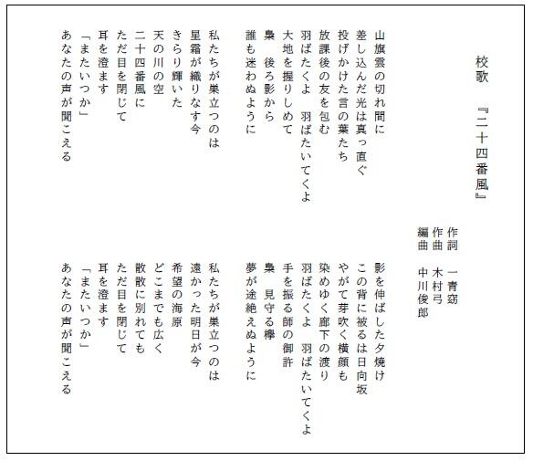中学生というと、個々の人間としての価値観も定まっていく大切な時期でもあるかと思いますが、そのような時に、「おおぐろの森」の恵まれた自然環境の中で、この校歌も、生徒の皆さん一人ひとりに間違いなく備わっている素晴らしい可能性に気づき、試練をも肯定的な光の中で受けとめていくことを少しでも後押しできるものであればと願っています。