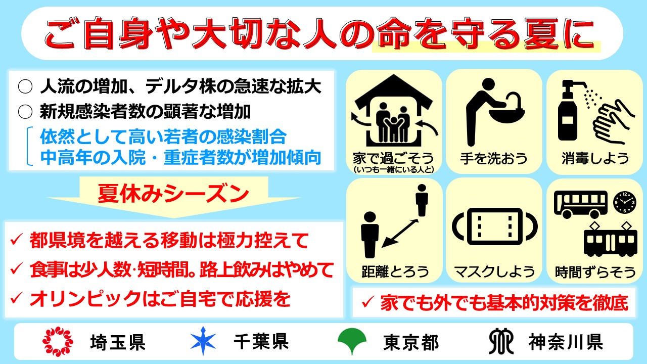 令和3年7月21日(水曜日)に、一都三県知事のコメントと共に、共同メッセージが発信されました。