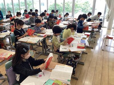 本校では、学期に2,3度のペースでボランティアの保護者の方々に読み聞かせをしていただいています子どもたちは、毎回の読み聞かせを心待ちにしています