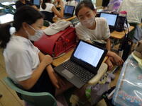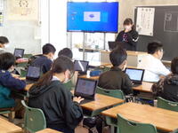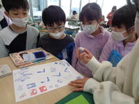 個人のタブレットPCを使いカレンダー作りやプログラミング、動画作成などを行っています。6年生を中心にグループで教え合いながら楽しんで活動をしています。