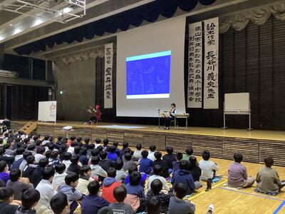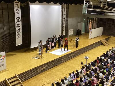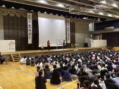 最後に、女優・作家の室井 滋さん絵本作家の長谷川 義史さんをお招きして、講演会を行いました。絵本「しげちゃん」の読み聞かせでは、「自分の名前を大切にしてほしい!」というメッセージが子どもたちに送られました。講演会後には、目をキラキラと輝かせながら「家に帰ったら、お父さんやお母さんに名前の由来をもう一度聞いてみようと思います!」などと話す子どもたちの姿が印象的でした。