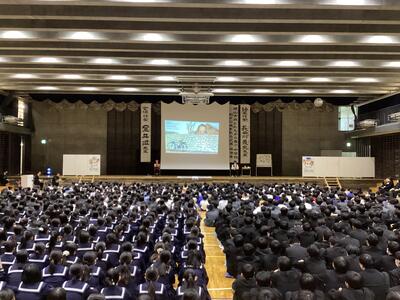 はじめに、体育館で式典を行いました。小・中学校の校長先生から開校から今日までの10年間の歩みについてお話があり、子どもたちは真剣に聞いていました。式典の後には、クラスごとに記念撮影を行いました。
