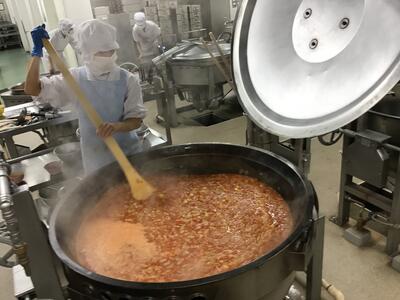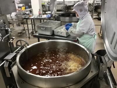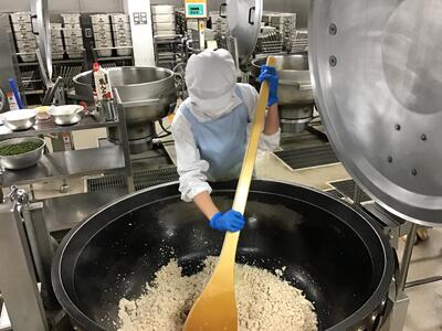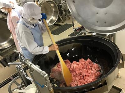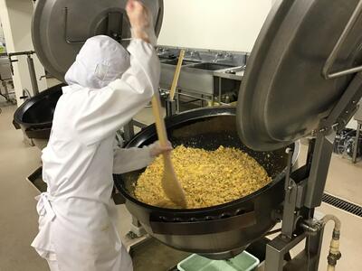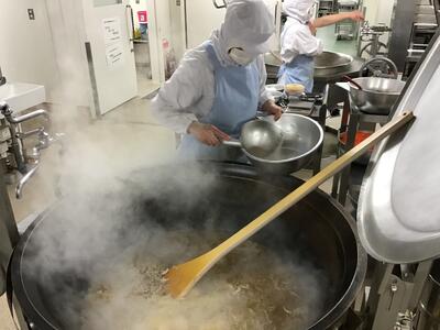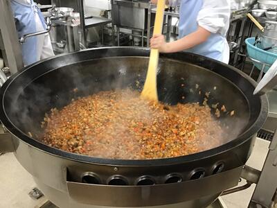 給食のカレーライスは、バターと小麦粉、カレー粉を1時間以上炒めて作っています。時間をかけて、ゆっくりていねいに作ることで、なめらかなルウになります。