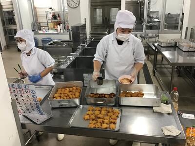 調理員さんのていねいなお仕事のおかげで、今日もおいしい給食ができました。感謝の気持ちをもって、たくさん食べましょう。