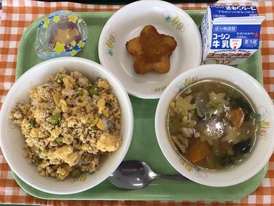 今日から5月です。5月といえば、新緑(しんりょく)が美しい季節です。新緑とは、木々や草花の芽が出てきて、鮮やかな緑になる 様子や色のことです。また、5月はお茶の季節です。特に5月1日は八十八夜(はちじゅうはちや)といいます。八十八夜は、立春から数えて88日目の日で、主に新茶の茶摘みや稲の種まきなど、春から夏にかわる時期の農業の目安になる日です。この日は、夏を迎える準備をするのに縁起が良い日、八十八夜に摘んだお茶を飲むと長生きするとも言われています。今日は抹茶を使った揚げパンにしました。ほろ苦い抹茶の香りと、砂糖の甘み、さくっと揚がったパンがとてもおいしいです。たくさん食べましょう。