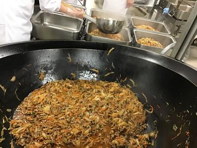 プルコギ丼は、肉や野菜など、あわせて約260kgの具材を炒めて、韓国風の甘辛い味付けにしました。