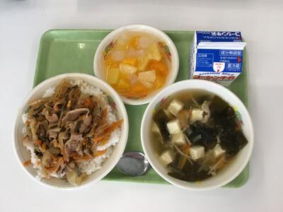 『牛乳 わかめご飯 生揚げのそぼろ煮 春野菜の豚汁 豆乳パンナコッタ』