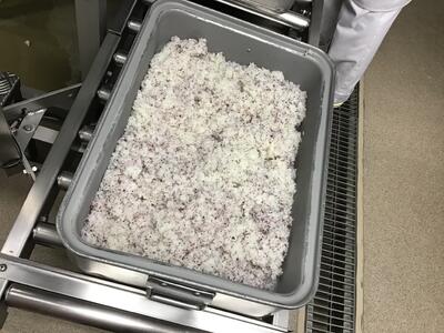 給食のサラダは、みなさんが安心して食べられるよう、衛生的に作るために、すべての野菜を1回ゆでてから、冷やしています。また、味がうすくなったり、食感が悪くなったりしないように、野菜から出た水分はていねいに取っていただいています。