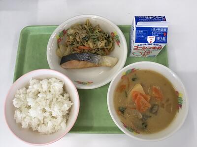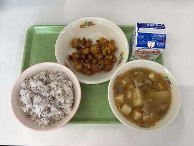 牛乳、ごはん、千葉県産いなだフライ、ひじきの炒り煮、千葉野菜たっぷり豚汁 です
