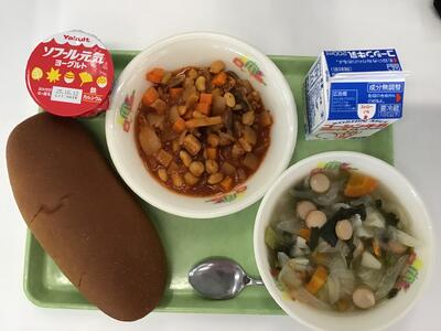 『ぶどうパン、ミートボールのトマト煮、ポトフ、牛乳』