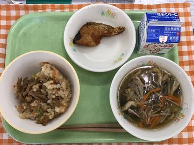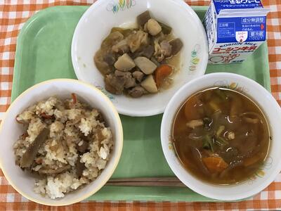 『鶏ごぼうおこわ、鶏肉と里芋の煮物、さつまいものみそ汁、牛乳』