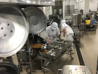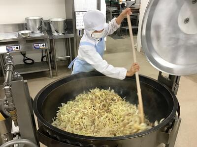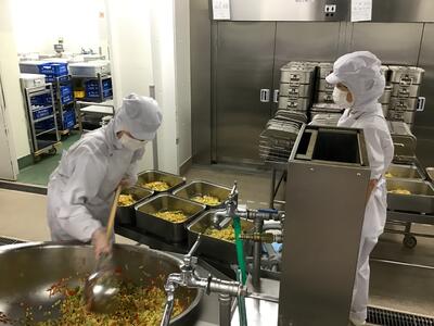 給食室では、小学校と中学校合わせて、約2,150人分の給食を作っています。今日は、人気メニューのカレーライスです。小学生も中学生も同じメニューを食べるため、カレーの辛さを変えて、みんながおいしく食べられるように工夫しました。好ききらいせずにいろいろなものをバランス良く食べて、元気に過ごしましょう!
