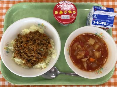 『肉みそ豆腐丼、五目スープ、白玉フルーツポンチ、牛乳』