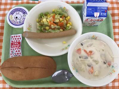 『牛乳 ピザドッグ ポテトサラダ ひよこ豆と野菜のスープ』