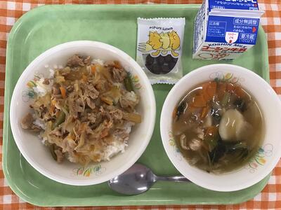 『豚肉どんぶり、いも団子汁、フルーツのさくらんぼゼリー和え、牛乳』