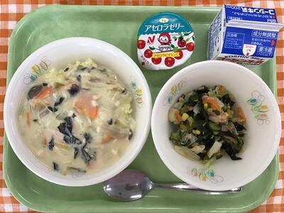 五目スープは、さまざまな種類の具材をたくさん入れた、具だくさんスープのことです。今日の給食では、豚肉、玉ねぎ、にんじん、キャベツ、たけのこ、しいたけ、小松菜、ねぎの8種類の食べものを使いました。いろんな食べものを入れることで、うまみがつまったおいしいスープになりました。急に気温が下がって、体が冷えやすいので、温かいスープをたくさん食べましょう。