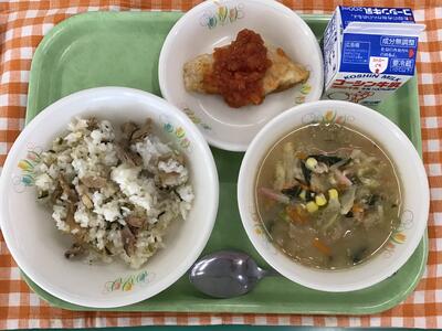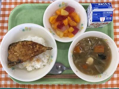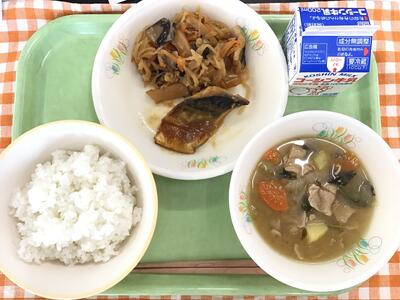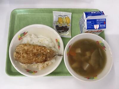 牛乳、ごはん、千葉県産いなだフライ、ひじきの炒り煮、千葉野菜たっぷり豚汁 です