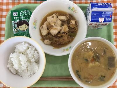 『みそ豚丼、いも煮汁、フルーツのりんごゼリーあえ、牛乳』