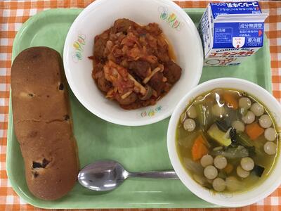 『ぶどうパン、ミートボールのトマト煮、ポトフ、牛乳』