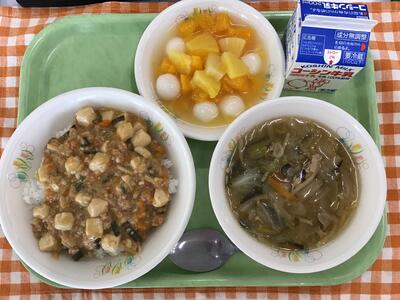 『肉みそ豆腐丼、五目スープ、白玉フルーツポンチ、牛乳』