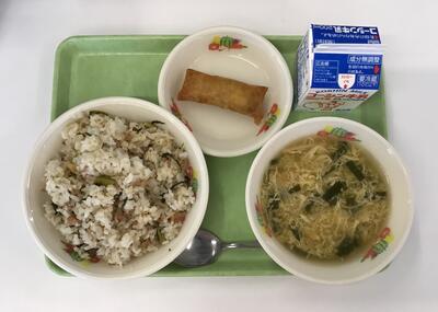 「牛乳、野沢菜チャーハン、春巻、ニラ玉スープ」