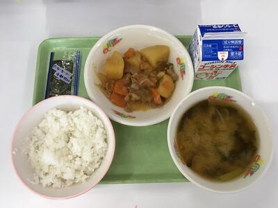 『ご飯、のりふりかけ、肉豆腐、豆乳みそしる、牛乳』