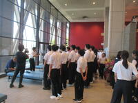今日は、体育館でキャンプファイヤーの練習を行っていました。