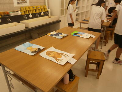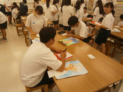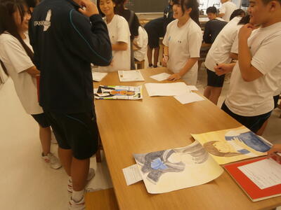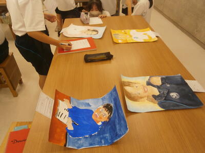 2年3組の美術の学習です。今日はクラスでお互いの作品を鑑賞していました。自画像では色使いやタッチなどの技法を工夫して、「友達と話していてとても楽しい自分」「部活動の試合前の緊張した自分」「思うように成長できない自分」「好きなことを思いっきり楽しんでいる自分」など、様々な自分を表現しています。お互いの作品のよさをたたえ合うすてきな時間でした。