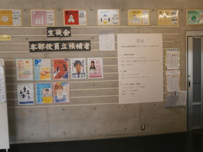 9月25日(木)は、生徒会役員選挙の日です。先週から選挙活動が始まり、朝と給食の時間にそれぞれの候補者が思いを語っています。昇降口の候補者のポスターも徐々に出そろってきました。