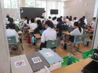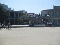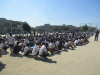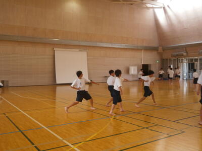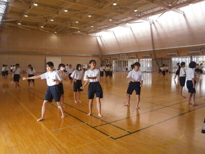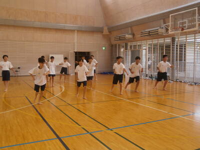 先週に引き続き、空手の練習です。グループで何度も何度も練習していました。キレのある動きの生徒、元気な声を出す生徒、動きに不安がある生徒など様々ですが、どの生徒も、自分たちで繰り返し復習することで、どんどん自信がついてきたようです。人の好きや得意はそれぞれ。体育の授業をきっかけに空手に興味をもつ生徒もいるかもしれません。今日は気持ちのよい秋晴れ。体育館脇通路の折戸を全開にして、自然の風の中で体育の学習に励んでいます。おおたかの森小中学校の風の道を心地よい風が通り抜けます。