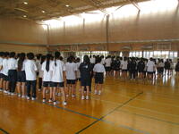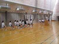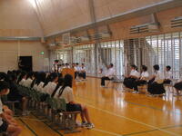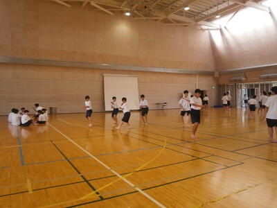 今日は、体育館でキャンプファイヤーの練習を行っていました。