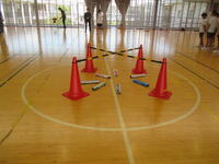 三角コーンとバーをファイヤーと想定して、その周りでレクリエーションや歌の練習を行いました。